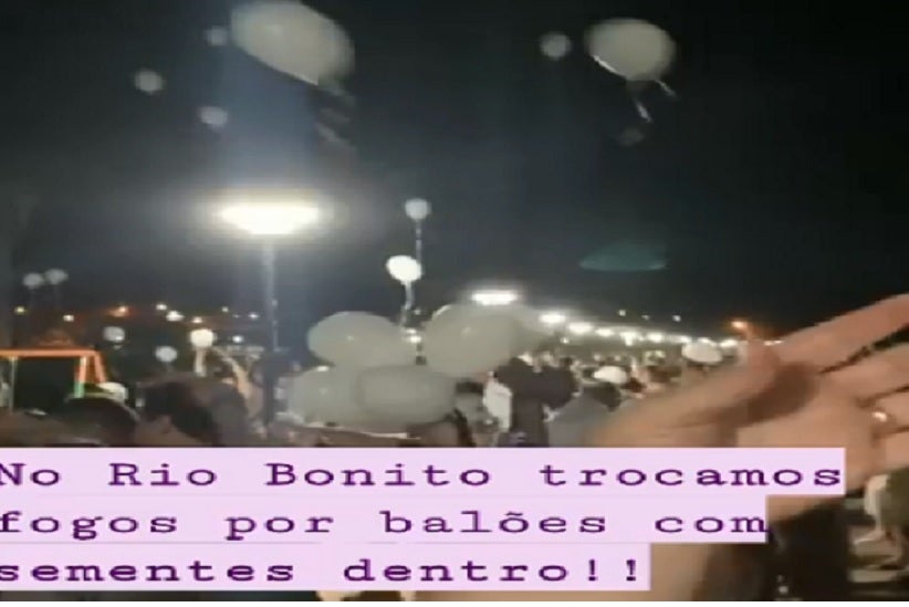 Moradores e visitantes do Rio Bonito soltam balões com sementes para celebrar a chegada de 2020