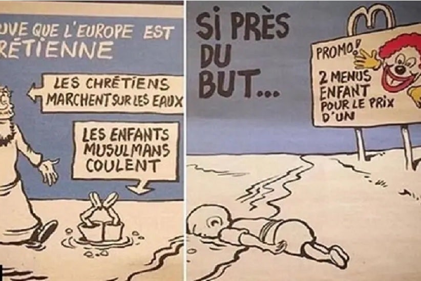 Novos cartuns do semanário, alvo de massacre em janeiro, tiram sarro da religião do sírio Aylan Kurdi